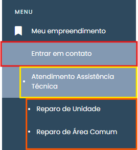 A estrutura da configuração dessa opção consiste em a aba “Entrar em Contato” ser um Grupo de Divisão, as abas que abriram (Assistência Técnica, Relacionamento, Solicitações Diversas) são as divisões de atendimento, conforme exemplo abaixo: