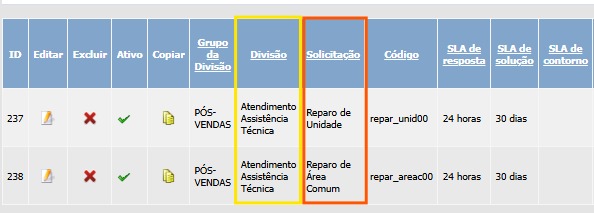 Nesta aba de divisões, é possível verificar todas as divisões cadastradas anteriormente, e incluir uma nova. Ao localizar a respectiva divisão, clique no ícone de edição e, após isso, será possível localizar as configurações da divisão.