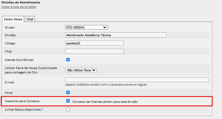 Aqui iremos nos atentar ao fato de que, para que esta divisão apareça para o cliente final, dentro do portal de clientes, será necessário habilitar a função “Acessível para Contatos:”, abaixo demarcada: