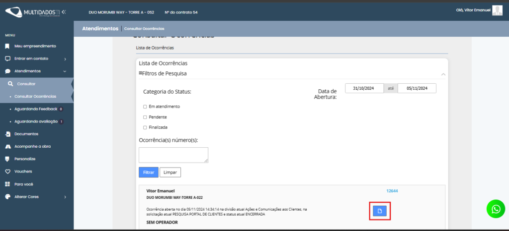 O cliente poderá filtrar os seus atendimentos de acordo com três condicionantes, sendo elas: