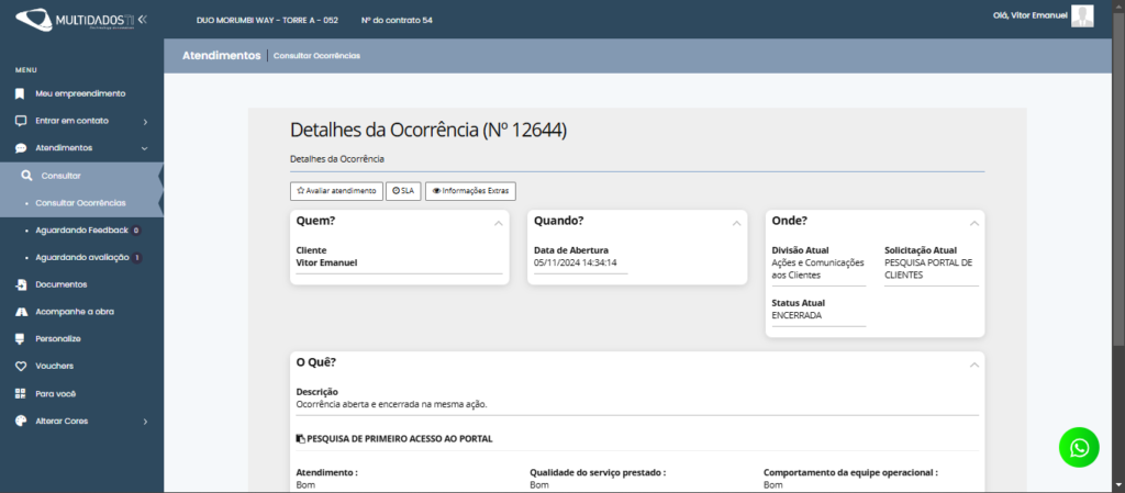 Após isso, ele será redirecionado para a página do chamado, onde ele visualizará a comunicação da empresa e ao selecionar o botão: